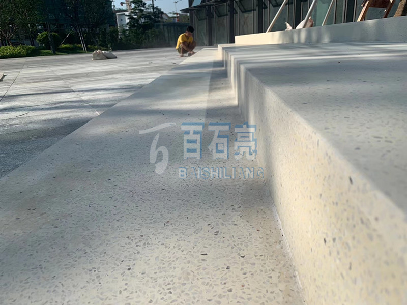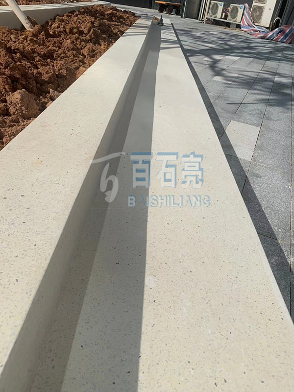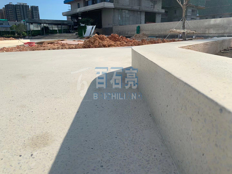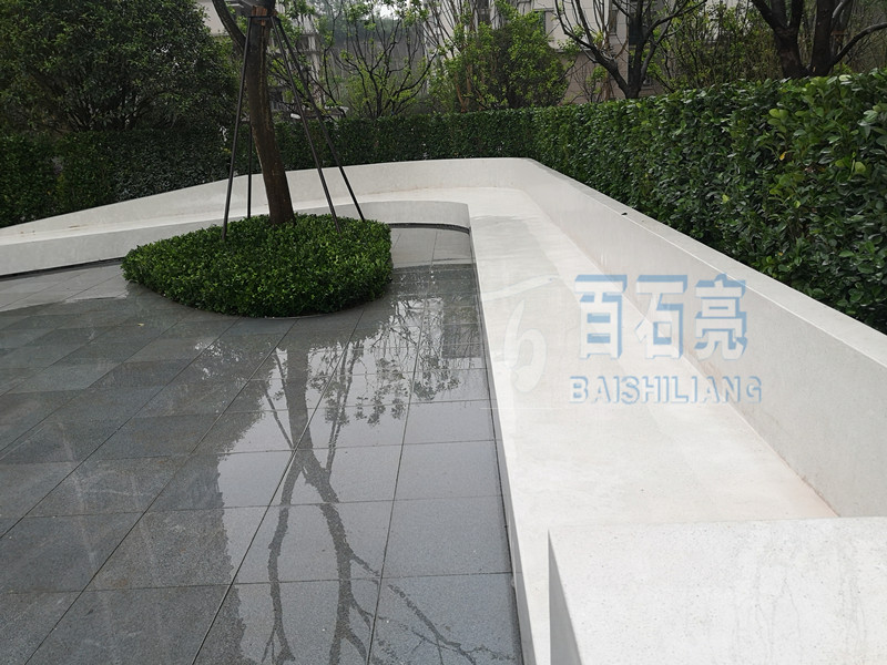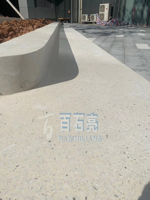 此項目位于重慶市北碚區蔡家的位于嘉陵江北畔,以坡地退臺式建筑,打造擁有超19公里一線江景的大平層、平墅、雙拼三大低密度的品質住宅產品。水磨石采用白色骨料加白色背景為主打色。 這樣的搭配讓人感覺大方又得體,整個水磨石坐凳一次成型沒有一絲縫隙。