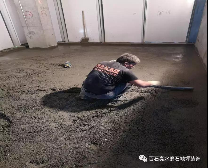 施工前期,我們的水磨石師傅在進行面層攤鋪。現在還只是水磨石基礎的工作,這一步需要耐心、細心。