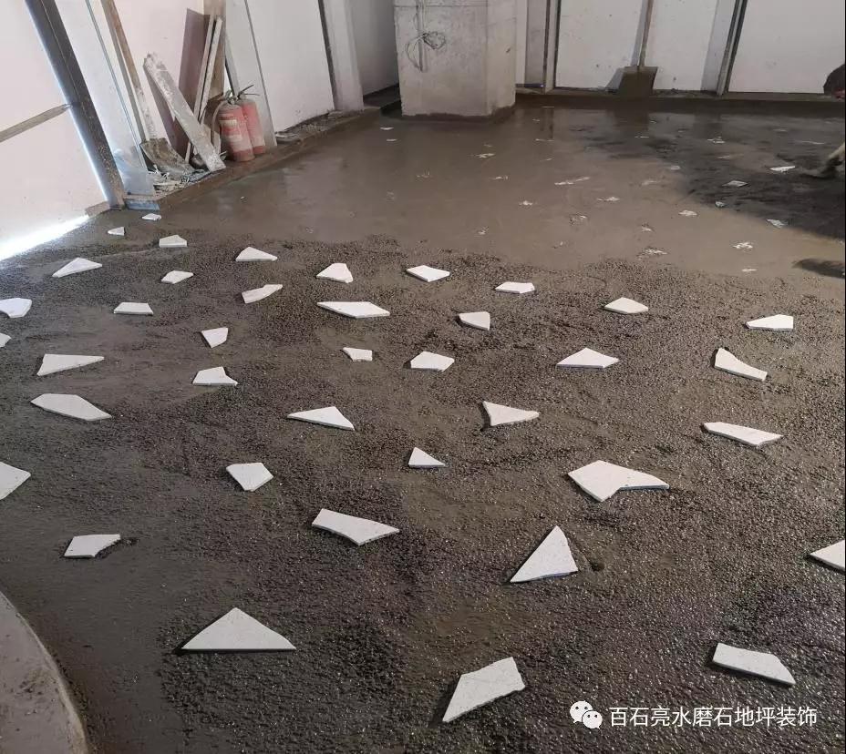 施工中期,師傅們在細石子中間點綴稍大的大理石,創意十足,為的是成品出來更加美觀。也是店里最大的的亮點之一。