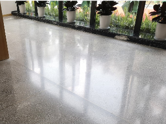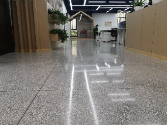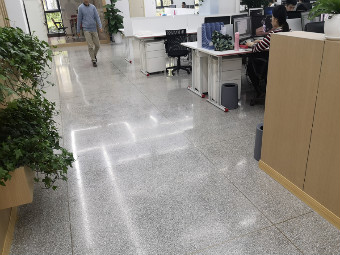 上圖是完工后的成果,灰色打底、點綴以白色的小石子,磨成后的水磨石總是在不經意間奪人眼球,試問?誰不想在這個干凈簡單而又不失靈動的水磨石上面來往走動、辦公呢?再搭配上辦公室內的綠植、木質的桌椅,渾然天成的感覺讓人眼前一亮。在這樣的環境中,人的心情也總會莫名的沉靜下來,辦公效率都不知不覺間提高了。