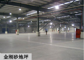 金剛砂耐磨地坪是由一定顆粒級配的礦物合金骨料,特種水泥,其它摻合料和外加劑組成,開袋即可使用。將其均勻地撒布在即將初凝階段的混凝土表面,經專門手段加工,從而與混凝土地面形成一個整體,且具有高致密性和著色的高性能耐磨地面。