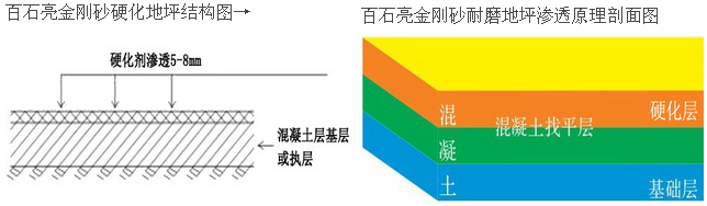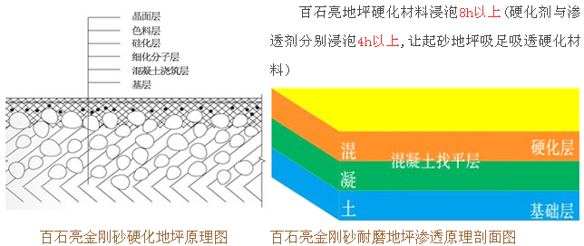 金剛砂地坪養護28天后→清潔地面→磨壓百石亮滲透劑→封堵毛細孔結晶→磨壓百石亮硬化劑→金剛砂聚硅改性→拋光百石亮晶面劑→金剛砂耐磨硬化地坪