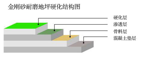 硬化型金剛砂地坪稱之為金剛砂硬化地坪或者混凝土硬化地坪,是采用源自德國進口技術研發的新地坪水料,通過打磨機壓滲封堵混凝土毛孔,形成高強高硬聚晶硅化層,阻隔空氣中的氧化物對混凝土的侵蝕,抑制混凝土中的鈣鎂離子析出并穩定混凝土的內部分子結構,達到混凝土內部密實改性的目的,從根本上確保地坪永不再起塵起砂。